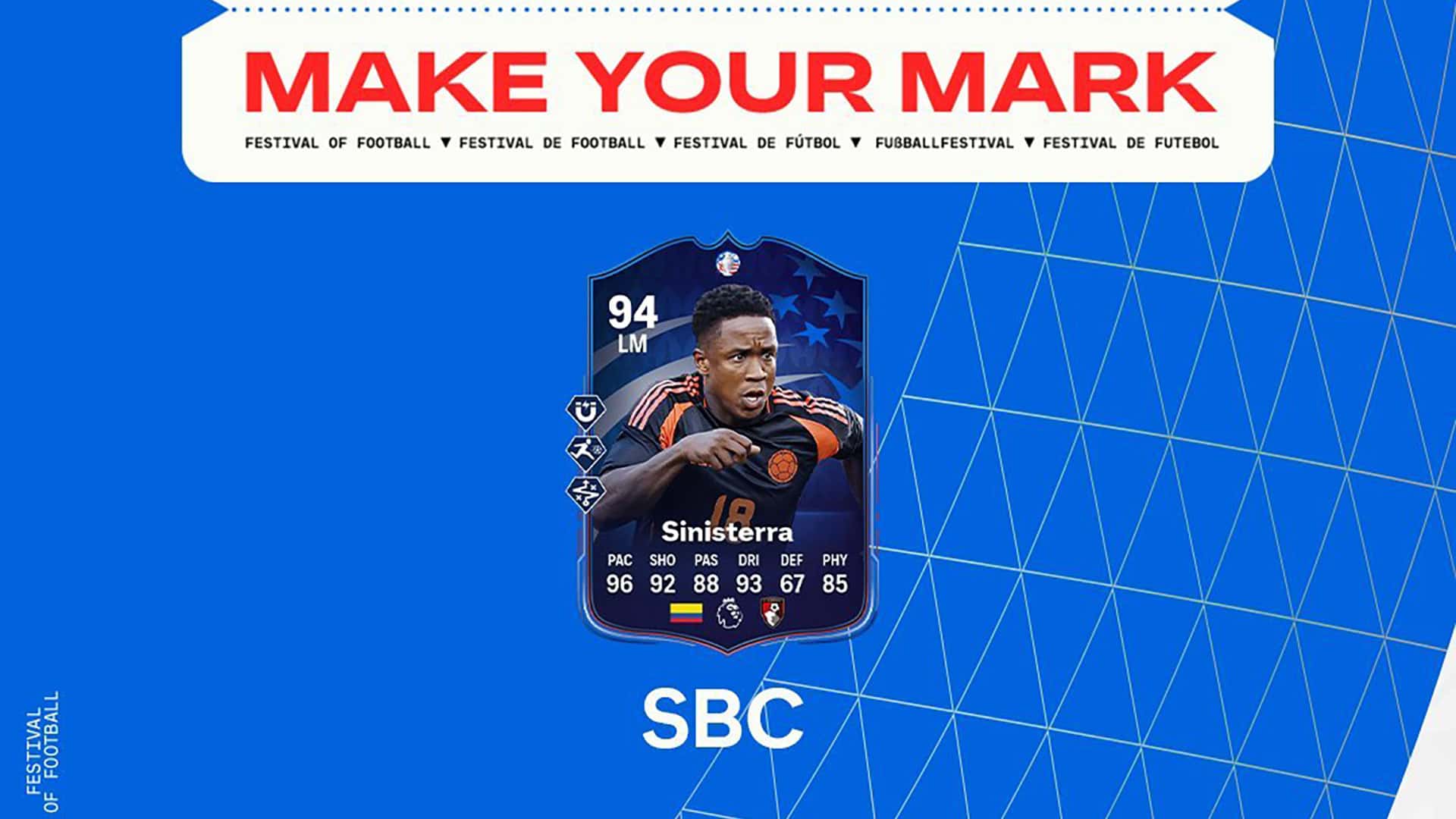The SBC Luis Sinisterra Make Your Mark SBC is now available in EA FC 24. The Make Your Mark Copa America 2024 Card for the Colombian Striker of Bournemouth can be redeemed by completing the Squad Building Challenge in UT at 6 PM on June 25th.