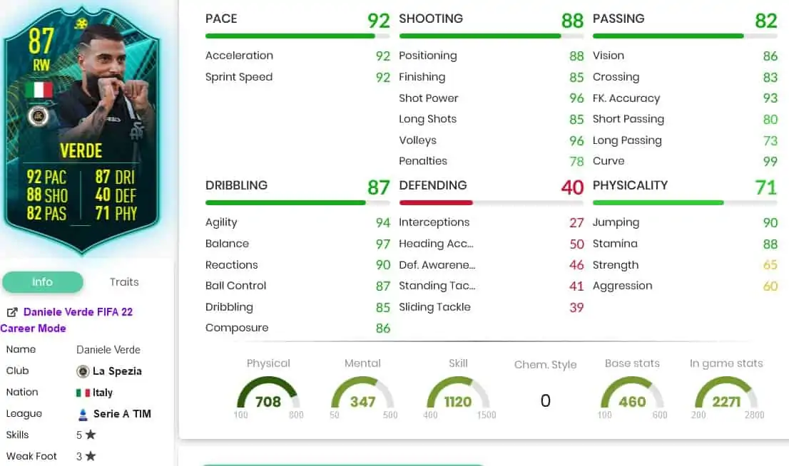 Verde has obtained an important boost to his base card stats: +8 to Pace, +15 to Shooting, +15 to Passing, +8 to Dribbling, +4 to Defending and +24 to Physical. It also had a boost at the Skill Moves 5* and Weak Foot 3* too.