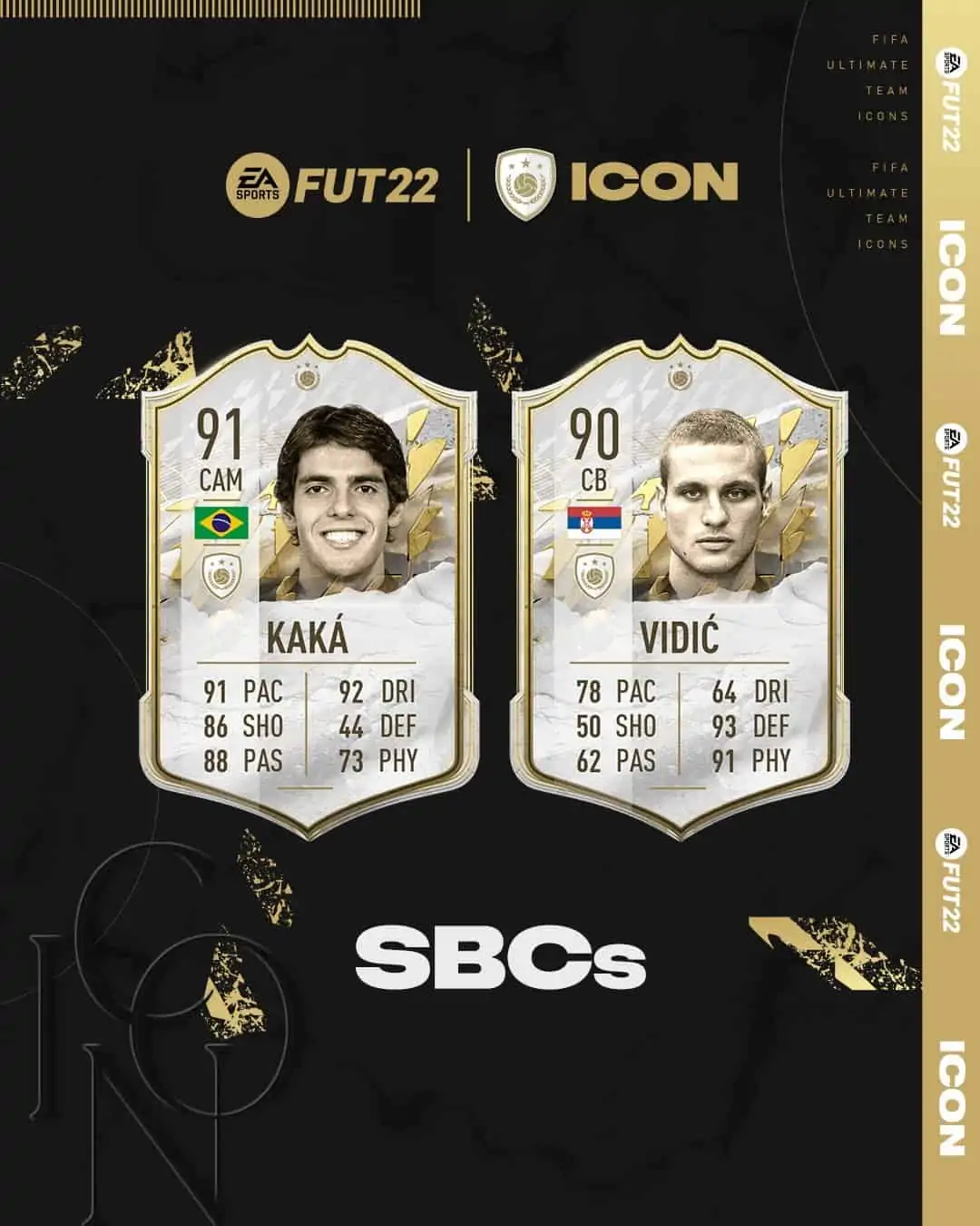 Electronic Arts has announced that it is now available the Squad Building Challenges ( SBC ) that allows unlocking the Icon cards version of the Kaka and Nemanja Vidic in FIFA 22 Ultimate Team ( FUT ) mode.